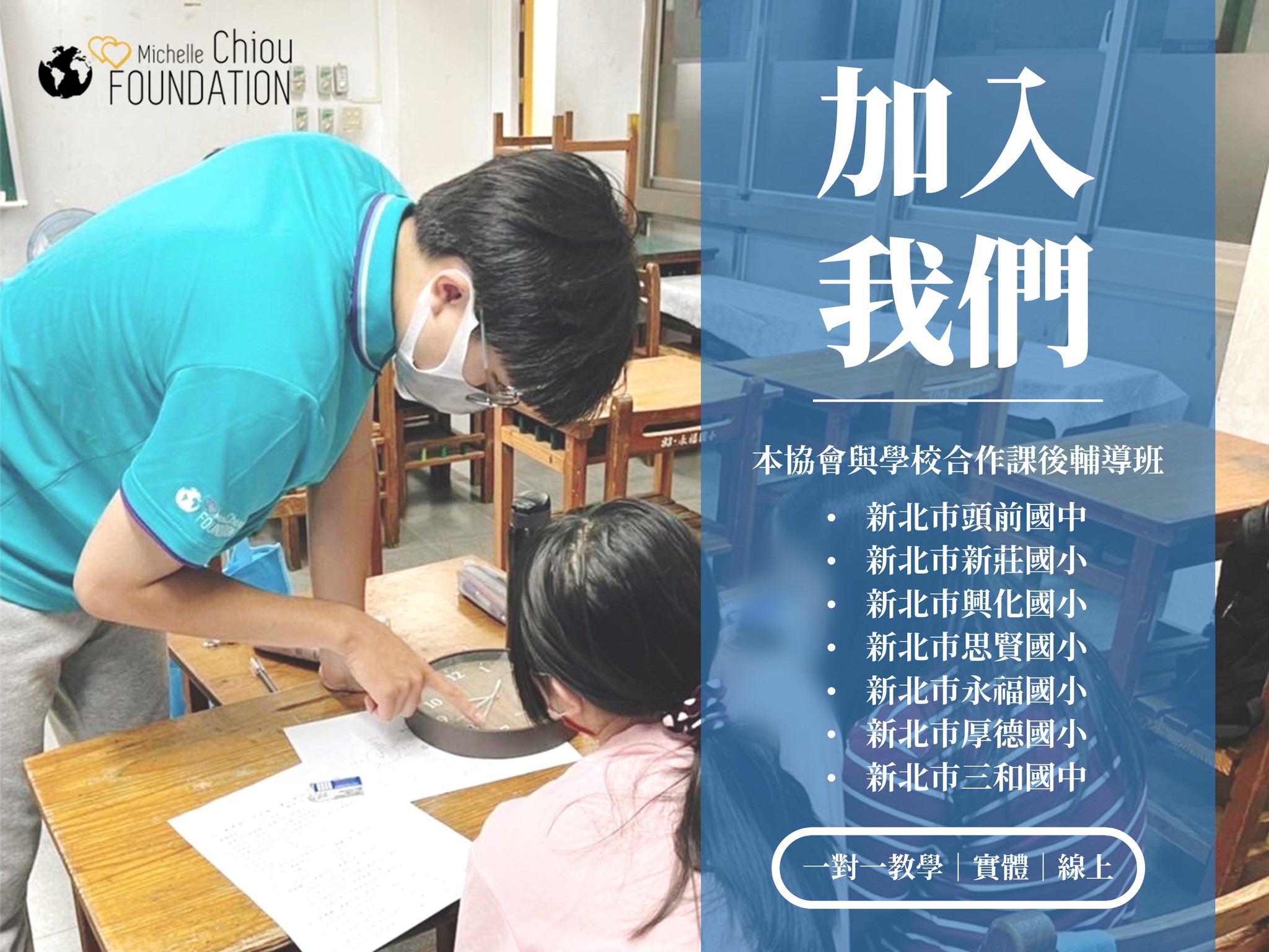 4.長期招募課輔志工,歡迎高二以上在學生、社會人士、退休人員、退休教師報名,非學生身份請提供三個月內良民證正本